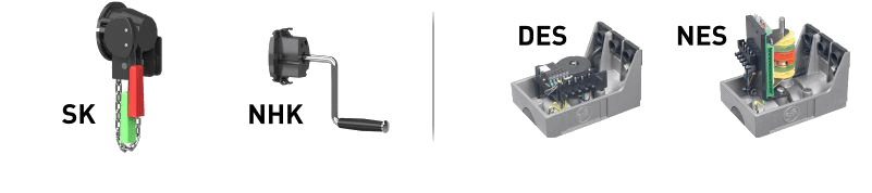 SI-ELEKTROMATEN, Drive for non-balanced doors which require an anti-fallback device, the patented safety brake is built into the gear, output torque 500Nm, output speed 10 rpm, hollow-shaft-Ø 40mm, supply voltage 3~230V/400V, with emergency hand crank for manual operation, digital limit switch DES, limit switch range E=20 revolutions max.